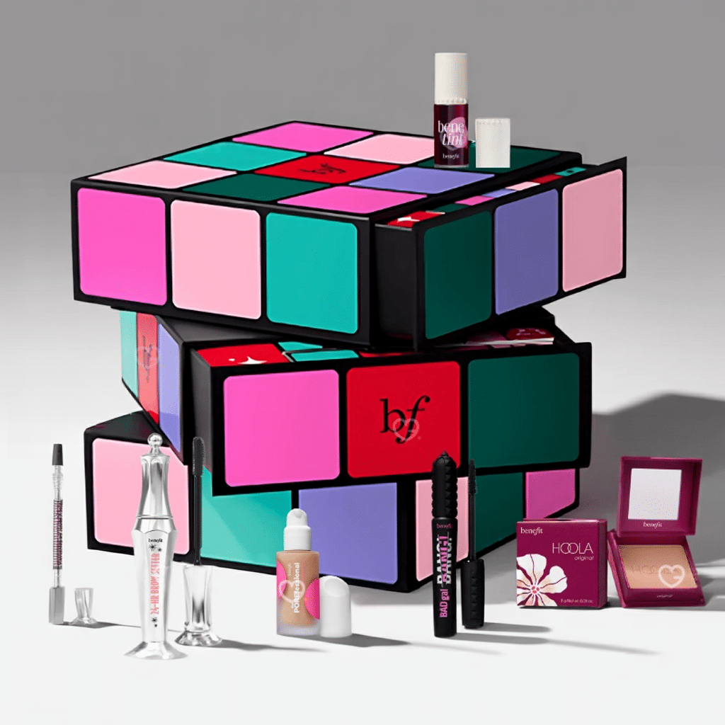 Découvrez le Calendrier de l'Avent Benefit 2025 "The Glam Cube", une expérience beauté exceptionnelle qui réinvente la tradition des fêtes avec style. Ce calendrier unique au format cube Rubik's révèle 24 produits iconiques Benefit en formats mini et deluxe, d'une valeur totale de 341€, pour un voyage quotidien à travers l'univers glamour de la marque californienne. Des mascaras légendaires aux solutions sourcils révolutionnaires, en passant par les blush cultes et les produits de soin innovants, chaque jour dévoile une surprise beauté soigneusement sélectionnée qui incarne l'esprit ludique et l'expertise de Benefit depuis 1976. Parfait pour les passionnées de beauté souhaitant explorer la gamme complète ou pour offrir une expérience premium inoubliable, ce calendrier transforme le compte à rebours des fêtes en un rituel beauté quotidien plein de découvertes et de plaisir.