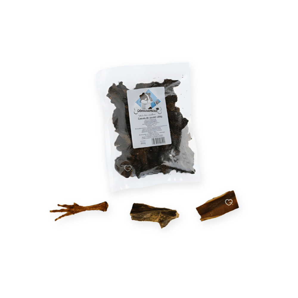 • Composition friandises poulet : 100% poulet (Protéines brutes 59,4%, Matières grasses 9,5%, Cendres 7,6%, Fibres 22,8%, Humidité 9%)