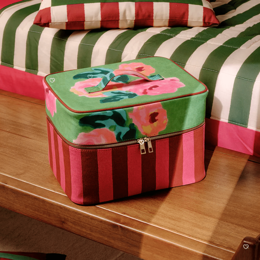 • Emballage : Vanity en coton avec motifs floraux sur fond vert, rayures roses et accents léopard bordeaux